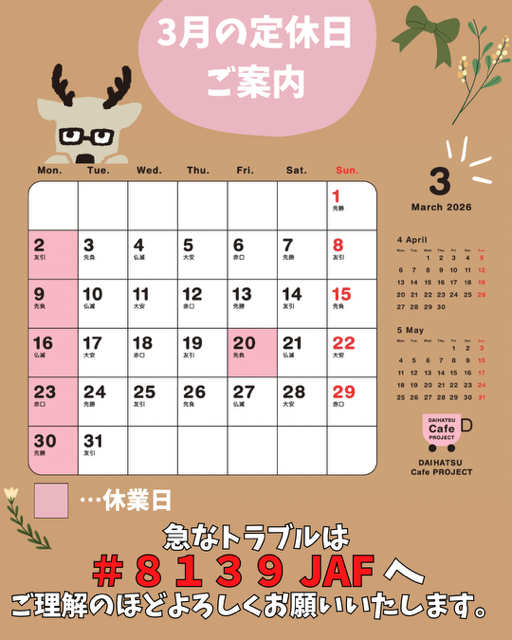 3月定休日&おもてなしスイーツのご案内